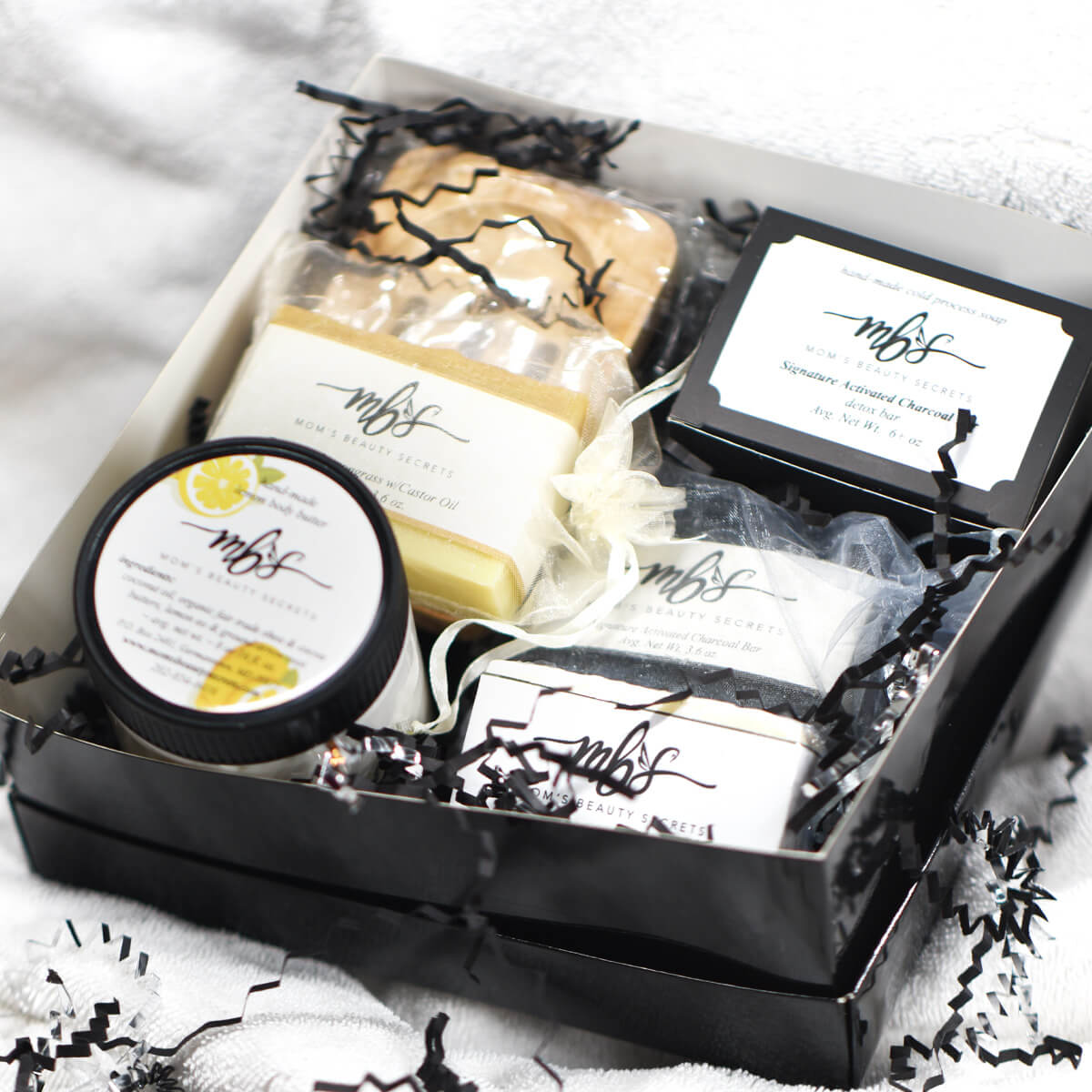 4 Bars of soap (To match your body butter) You will also receive 4 bars of soap that are carefully selected by Mom’s Bauty Secrets to match your body butter. Everything will be included in your suprise gift box. All of them are natural, sulfate-free, paraben-free and gluten-free for a healthier lifestyle.