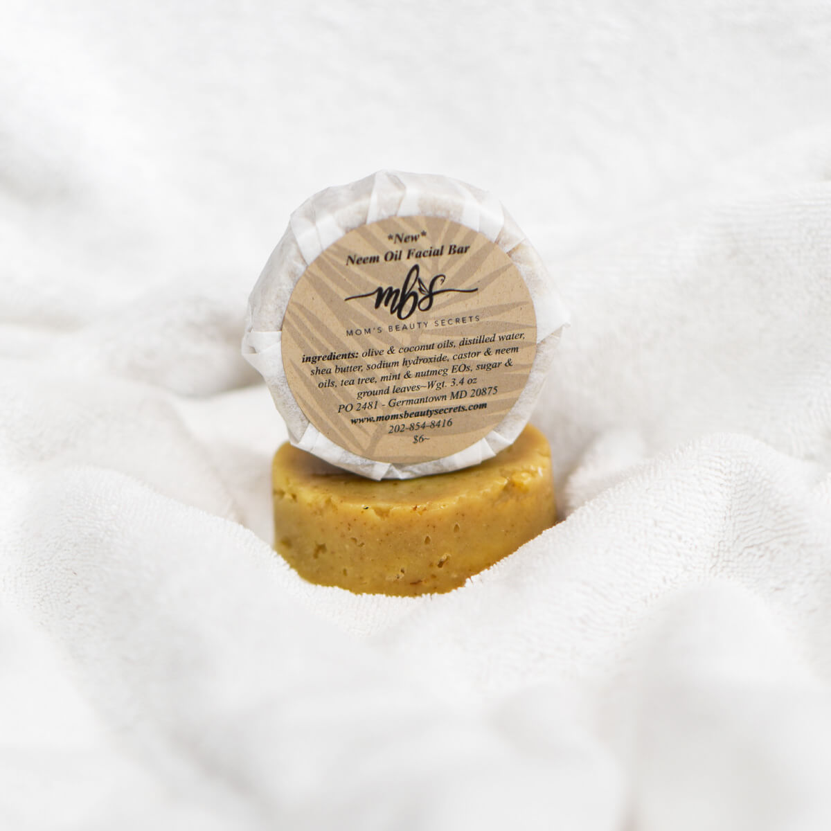 Ingredients: olive oil, coconut oil, organic fair trade shea butter, organic fair trade cocoa butter, distilled water, Neem Oil (7%), sodium hydroxide (converts oil to soap), Castor Oil, peppermint essential oil, nutmeg essential, ground neem leaves and sugar [adds lather naturally].