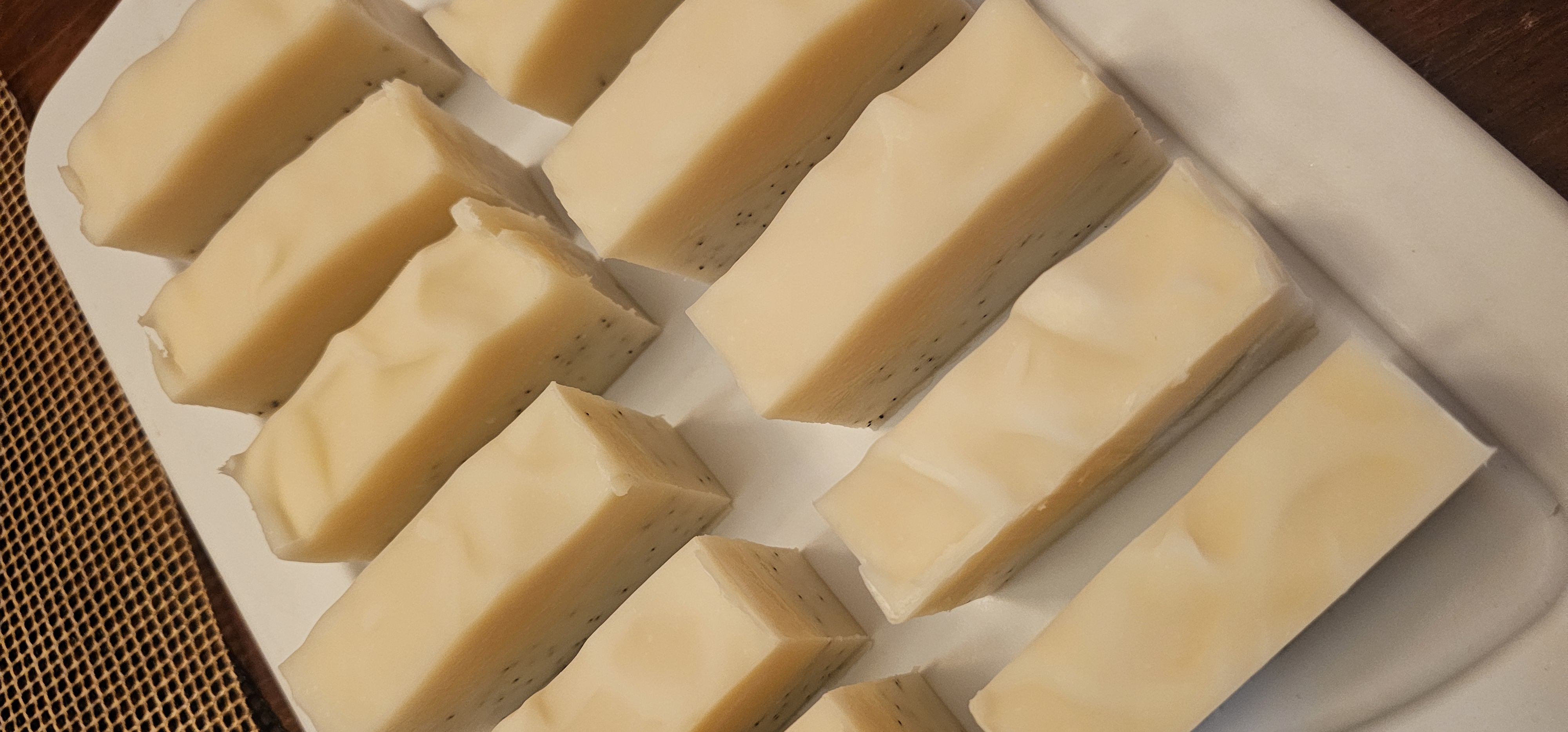 Ingredients: olive oil, coconut oil, organic fair trade shea butter, sodium hydroxide [converts oils to soap], Castor Oil, vanilla, sandalwood essential oil, sugar [adds sugar naturally] & and poppy seeds to naturally exfoliate.